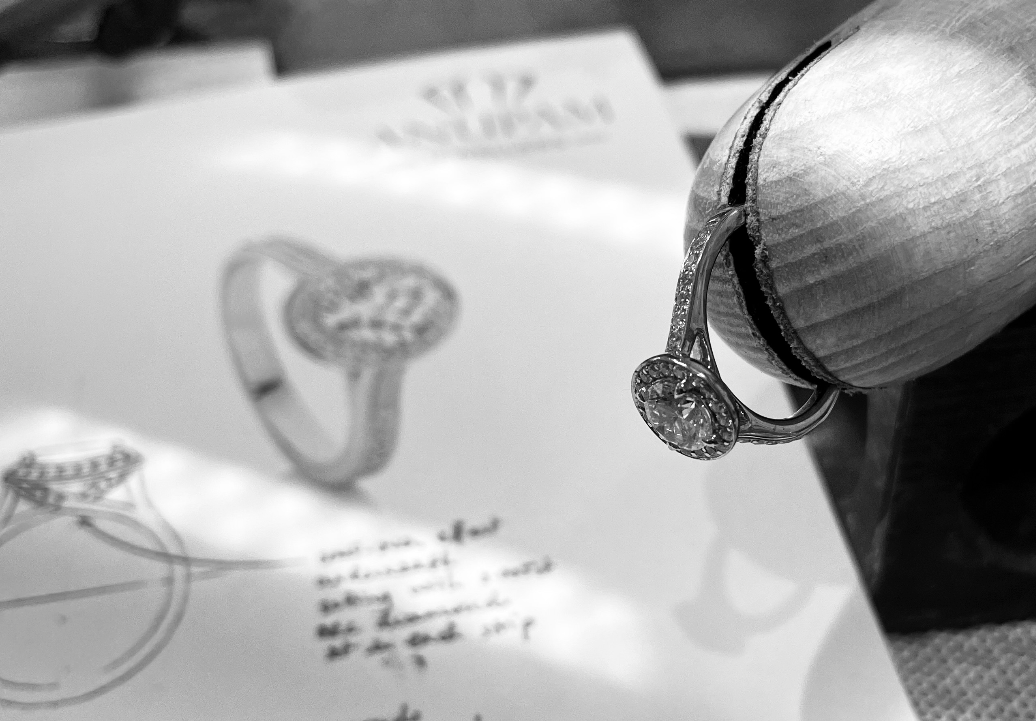 Once we have all the above, We work to create as many visuals for you as possible so that you can picture just how your bespoke piece of jewellery will be finished. With sketches and materials as well as loose stones so that you can hand select your own gemstone.